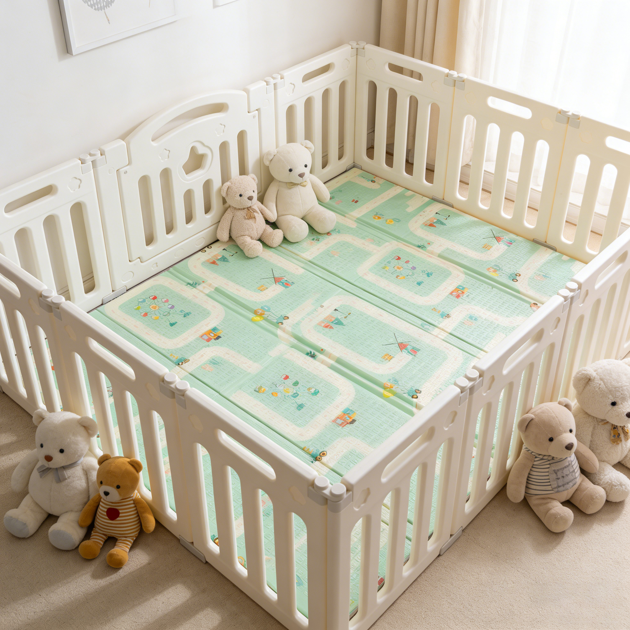 Our mats for infant playpens very easy to clean, just wipe with a damp towel to remove water stains, stains, and dirt, providing a hygienic play space for babies.